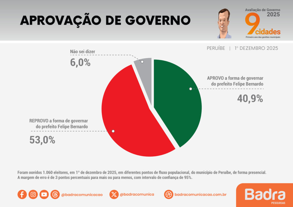 Já quem aprova a forma de Governar de Felipe, é 40,9%, o que curiosamente apresenta uma tímida melhoria se comparada a última feita pelo mesmo instituto, que era de 35,2% no levantamento feito em agosto, de 2025.